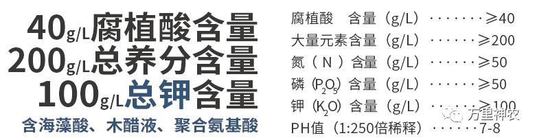 主要技术指标:腐植酸≥40g/L,N+P2O5+K2O≥200g/L(100g/L总钾含量),中微量元素按不同地区土壤配制。